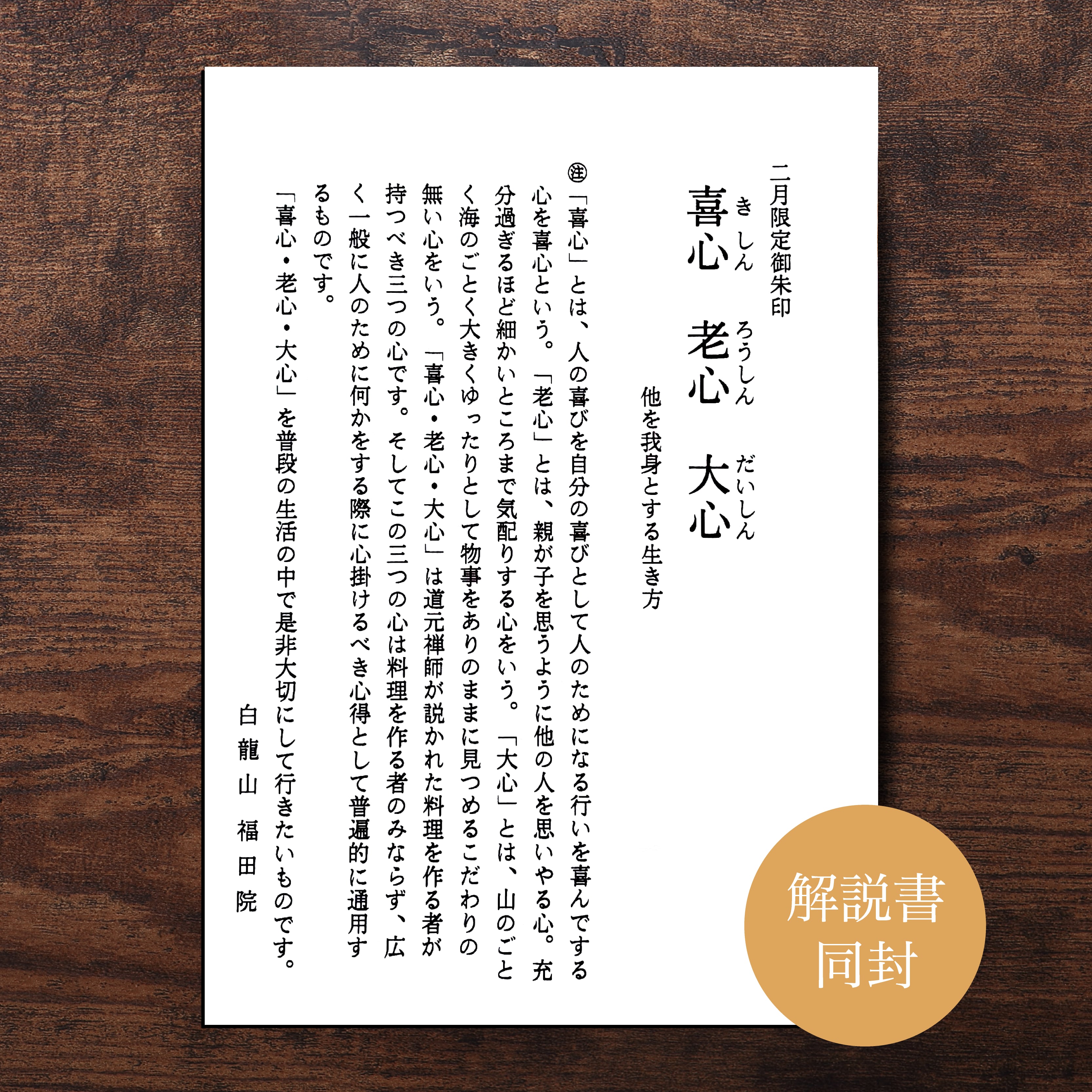 注:「喜心」とは、人の喜びを自分の喜びとして人のためになる行いを喜んでする心を喜心という。「老心」とは、親が子を思うように他の人を思いやる心。充分過ぎるほど細かいところまで気配りする心をいう。「大心」とは、山のごとく海のごとく大きくゆったりとして物事をありのままに見つめるこだわりの無い心をいう。「喜心・老心・大心」は道元禅師が説かれた料理を作る者が持つべき三つの心です。そしてこの三つの心は料理を作る者のみならず、広く一般に人のために何かをする際に心掛けるべき心得として普遍的に通用するものです。